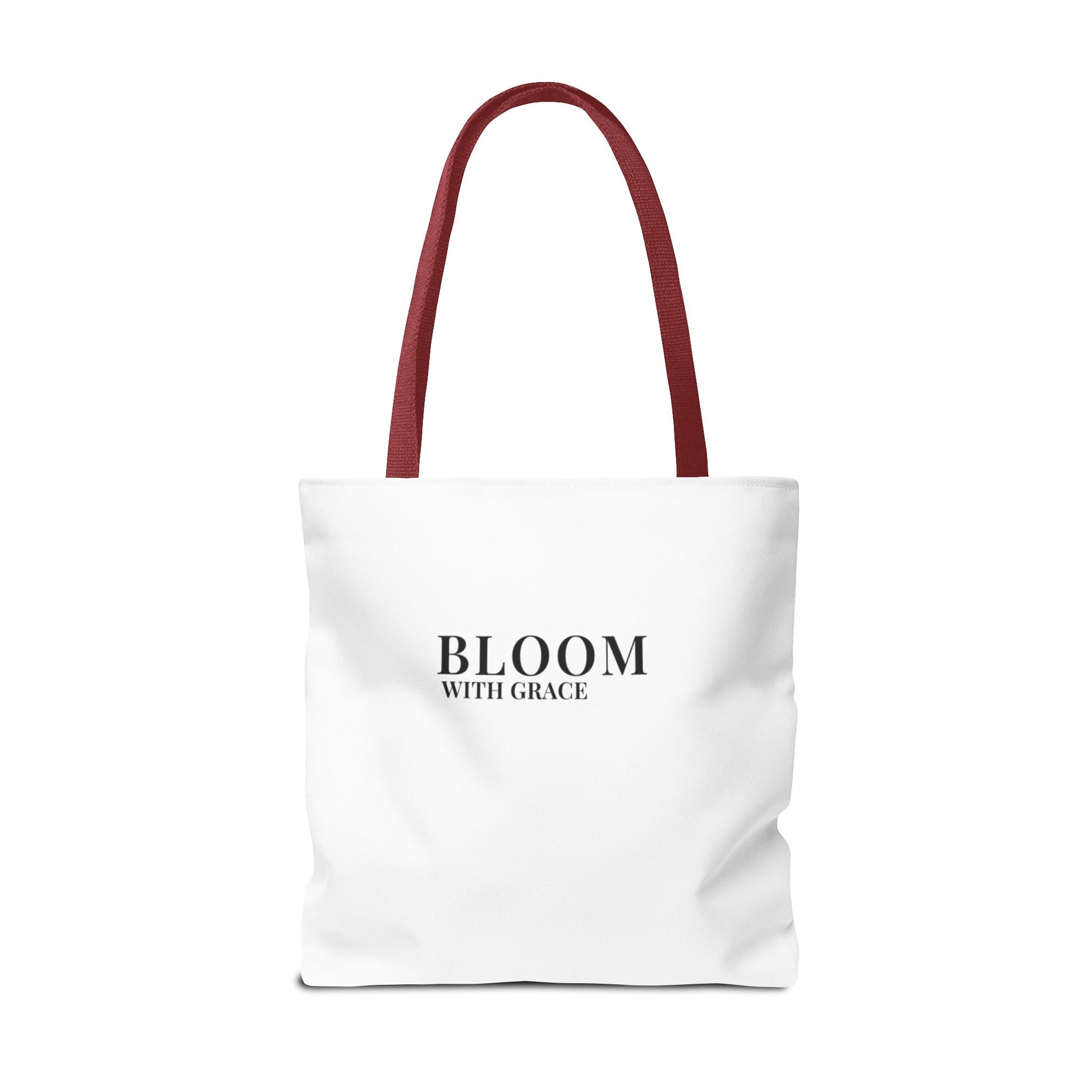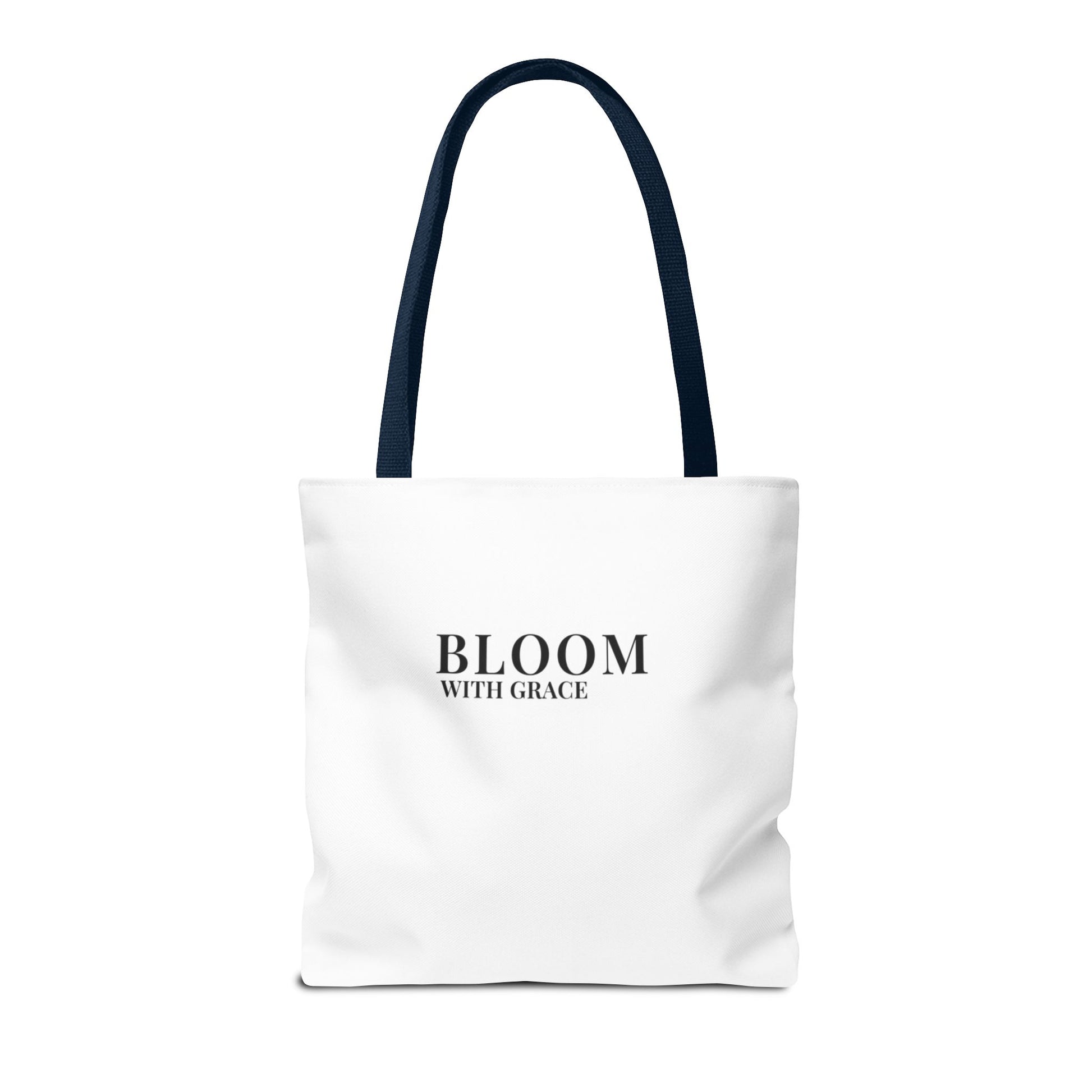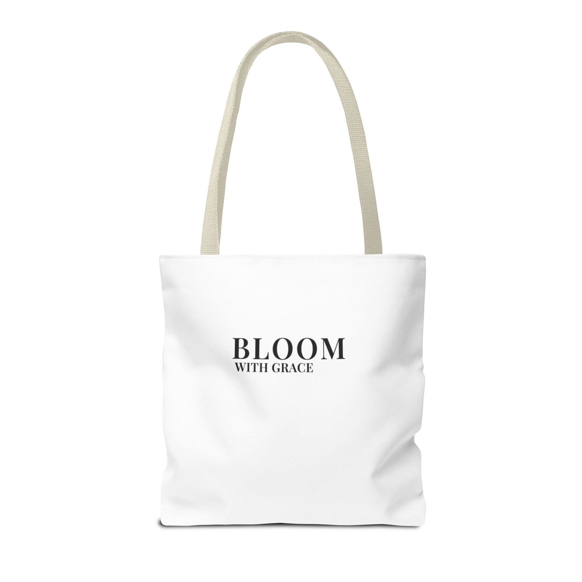 This lightweight, structured tote blends quiet elegance with everyday practicality. The clean white body and minimalist black 'BLOOM WITH GRACE' print create a calm, confident look that slips easily into daily routines — from morning coffee runs to library afternoons. Boxed corners and reinforced handle stitching mean the bag keeps its shape and carries groceries, notebooks, or market finds without sagging. The soft cotton handles and quick-dry polyester body stand up to frequent use, and five handle color options let you add a subtle personal touch. It’s the kind of tote that reads like a small, steady reminder to move through the day with intention and style.