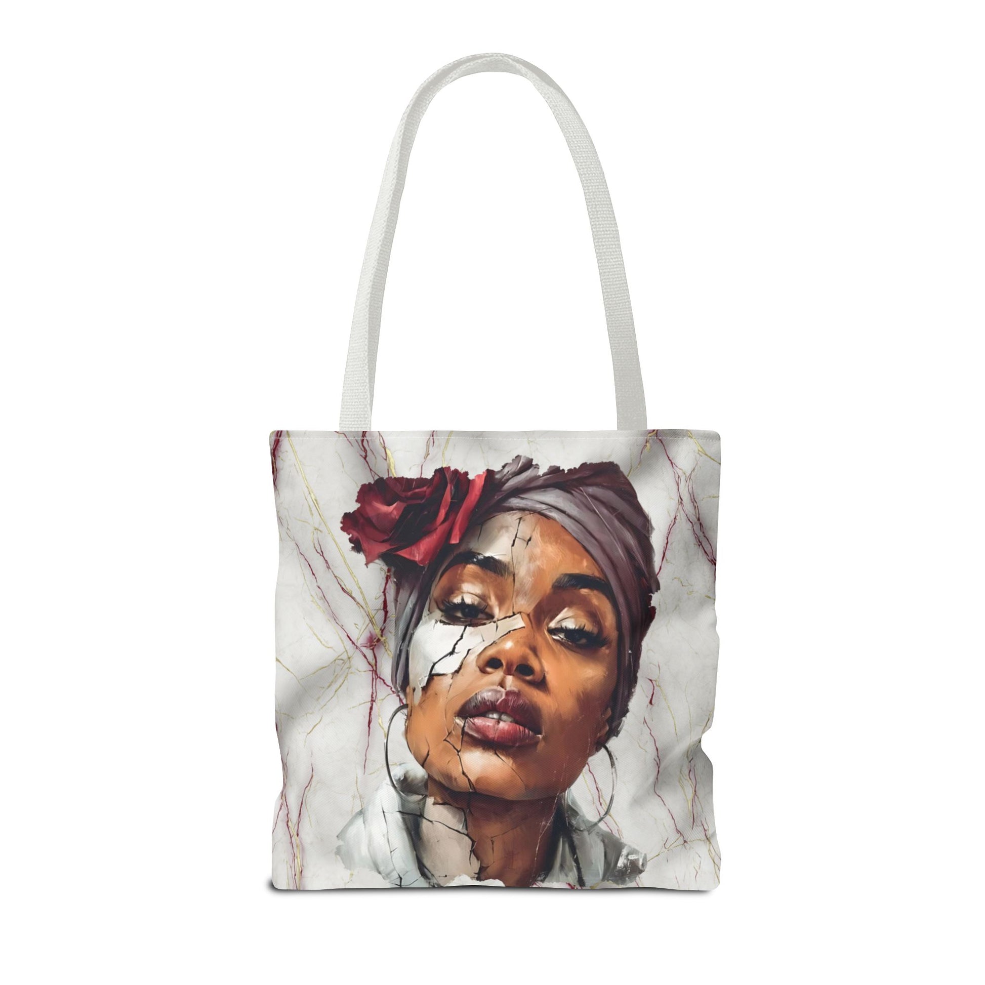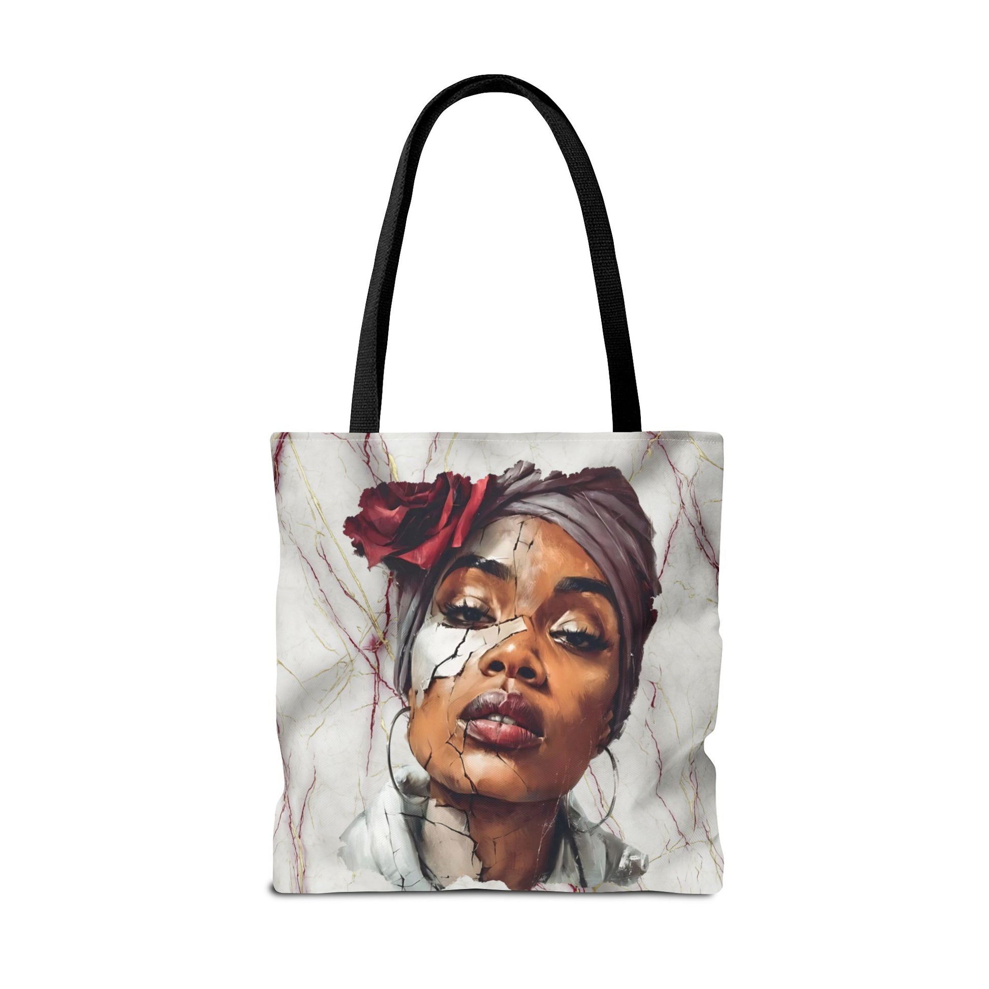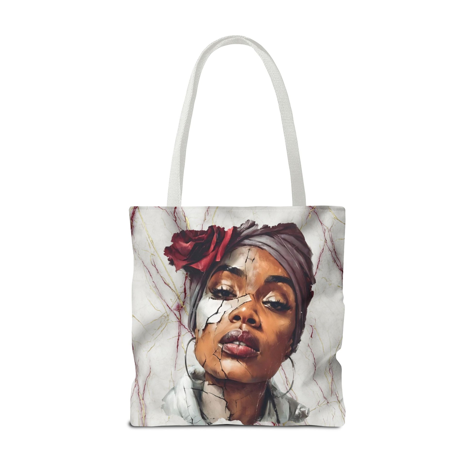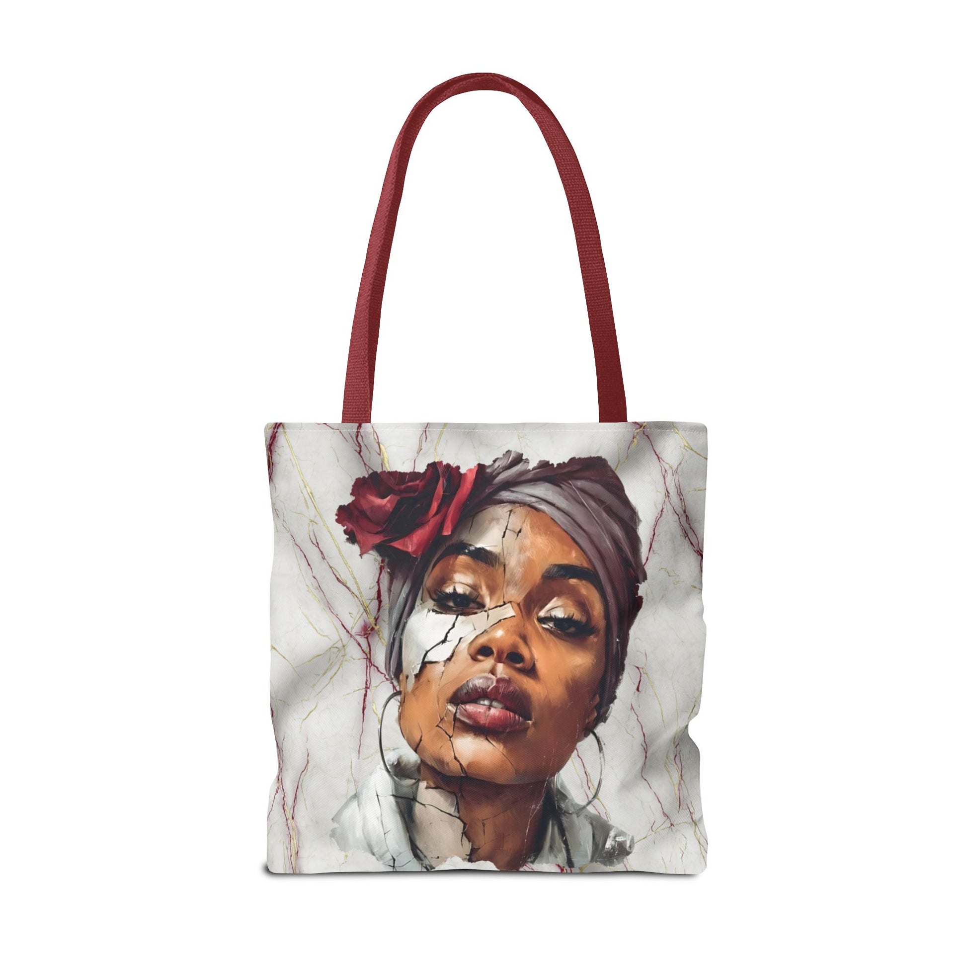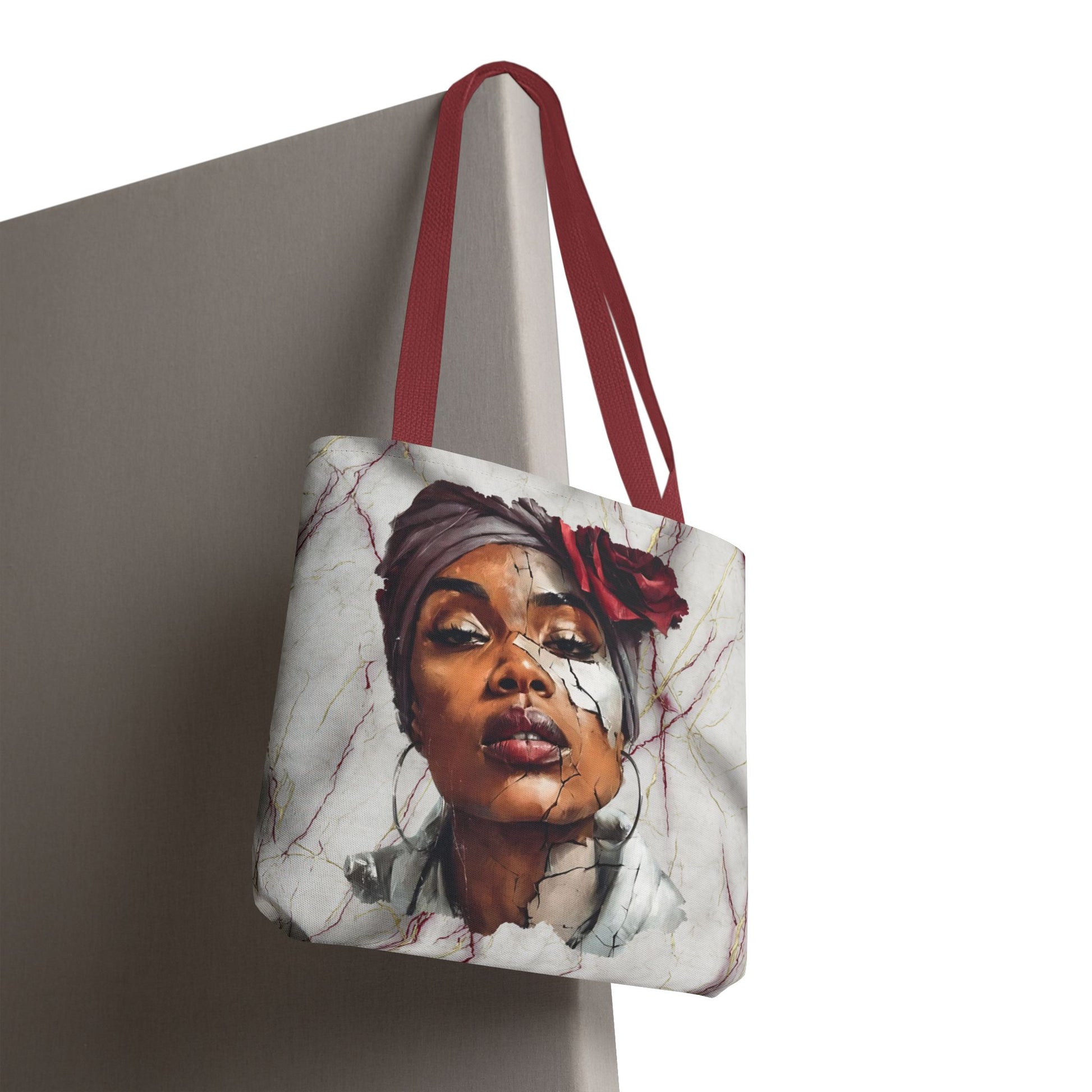 Regal Fracture Afrocentric Tote Bag, Cracked Portrait Art Tote with Red Rose, Black Queen Shoulder Bag, Cultural Fashion Tote for Women